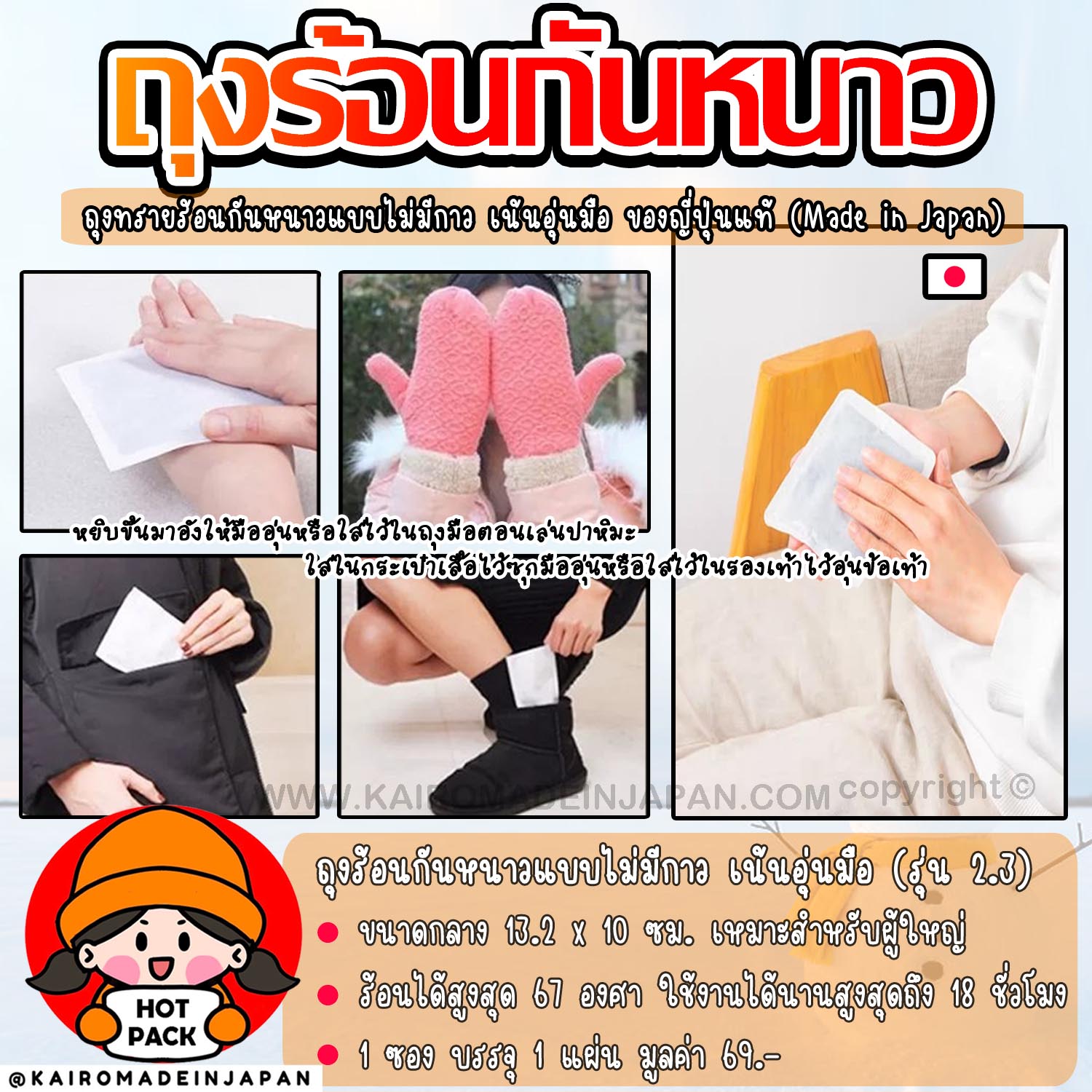 ● ถุงร้อนกันหนาวแบบมีกาว สำหรับใส่ในกระเป๋าเสื้อกันหนาว เน้นอุ่นมือ ● ขนาด 13.2 x 10 ซม. ● ร้อนได้สูงสุดถึง 67 องศา ● ใช้งานได้นานสูงสุดถึง 18 ชั่วโมง ● ราคาเพียง 69 บาท / แผ่น  ● MADE IN JAPAN ของญี่ปุ่นแท้ นำเข้าจากญี่ปุ่น ไม่ใช่ของจีนปกญี่ปุ่นแน่นอนค่ะ ✨ สินค้าของทางร้านนำเข้าโดยตรง วันหมดอายุล็อตปัจจุบัน ปี 2571 เลยนะคะ ! ✨