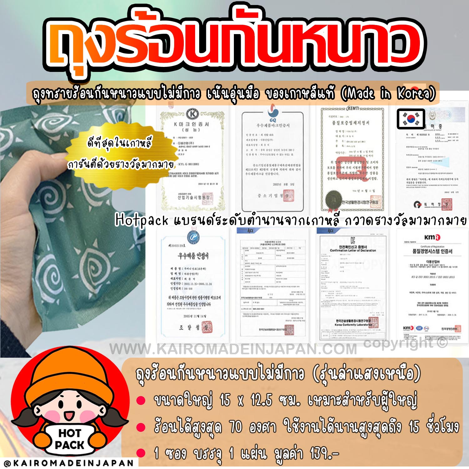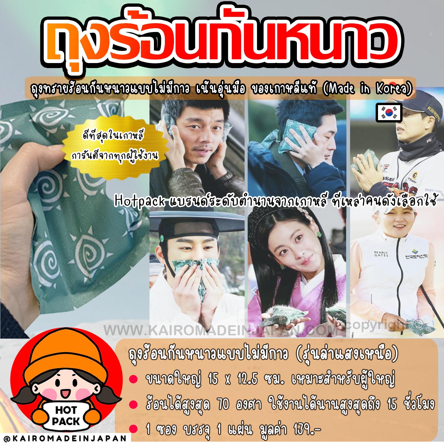 | Tags | kairomadeinjapan kairo hotpack ไคโระ ฮอทแพค ฮอตแพค แผ่นร้อนกันหนาว แผ่นแปะร้อนกันหนาว แผ่นร้อนแปะกันหนาว แผ่นแปะให้ความร้อน แผ่นให้ความร้อน ถุงร้อนกันหนาว ถุงทรายร้อน ถุงร้อนอุ่นมือ ถุงอุ่นมือ ถุงอุ่นร้อน เที่ยวต่างประเทศ อุปกรณ์กันหนาว ลุยหนาว ลุยหิมะ เล่นหิมะ เล่นสกี แสงเหนือ ล่าแสงเหนือ แผ่นร้อนอุ่นเท้า แผ่นอุ่นเท้า แผ่นแปะถุงเท้ากันหนาว แผ่นร้อนแปะถุงเท้า ถุงเท้ากันหนาว ถุงอุ่นเท้า นำเข้าจากญี่ปุ่น นำเข้าจากเกาหลี ประคบร้อน แผ่นเจลร้อน แผ่นเจลอุ่น แผ่นร้อนกันหนาวของญี่ปุ่นแท้ ขนาดเล็ก แผ่นกันหนาว แผ่นแปะอุ่น แผ่นความร้อนกันหนาว แผ่นแปะกันหนาว แผ่นร้อนตัวให้ความอบอุ่น hot hand ทรายร้อนกันหนาว ทรายร้อนญี่ปุ่น ทรายร้อนเกาหลี |